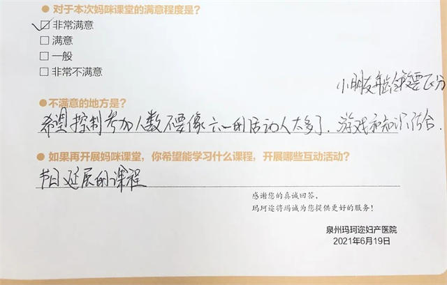 今天玛珂迩举办了2021年第4期妈咪课堂,在以往的满意度调查中,妈咪课堂都得到大家100%满意的好评,但是在2021年的父亲节活动,玛珂迩却被吐槽了。原因竟是【活动参与人数太多】,虽然客人还是给了【非常满意】的评价,但小玛把这张满意度调查打在公屏上,督促小玛深刻反思,争取下次活动提升客人参与满意度。