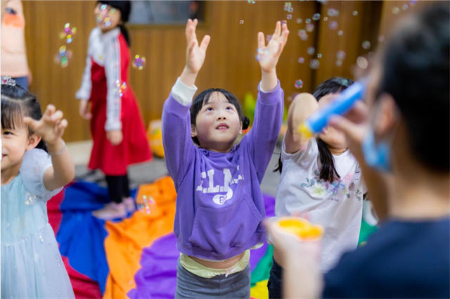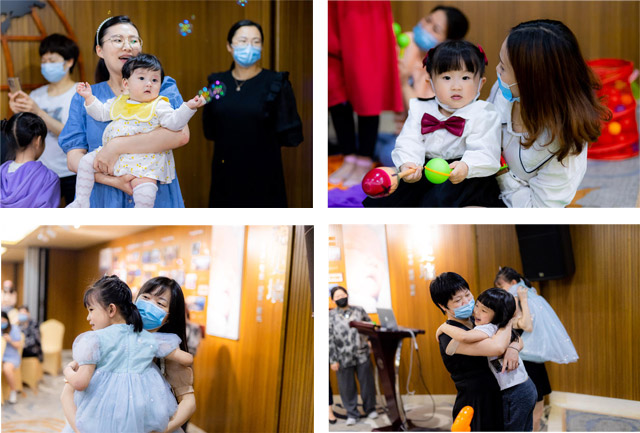 宝贝们坐在各自妈妈的腿上,妈妈们配合着老师的指令,跟着“直升机”起飞降落......跟着老师的歌声摇动手中的乐器,徜徉在泡泡气球的世界里,欢笑声包围了整个活动会场。